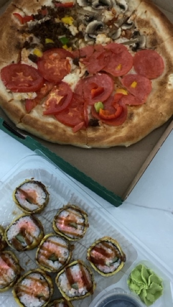 суши немного не соответствует фото, но по вкусу неплохо, пицца была сухая и с малым количеством сыра, крылышки были вкусными, а вот курица в кисло-сладком соусе сухая, и совершенно не соответствует фото