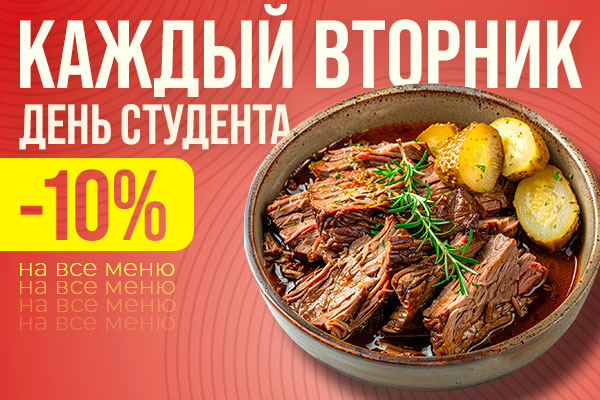 Скидка 10% на все меню по четвергам! (АКЦИИ НЕ СУММИРУЮТСЯ)