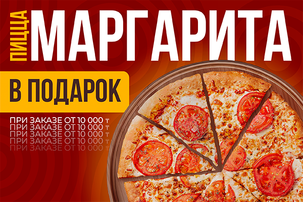 При заказе от 10 000 тг. пицца Маргарита в подарок! (АКЦИИ НЕ СУММИРУЮТСЯ)