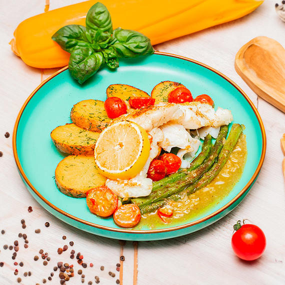 Судак с томатами, базиликом и картофелем