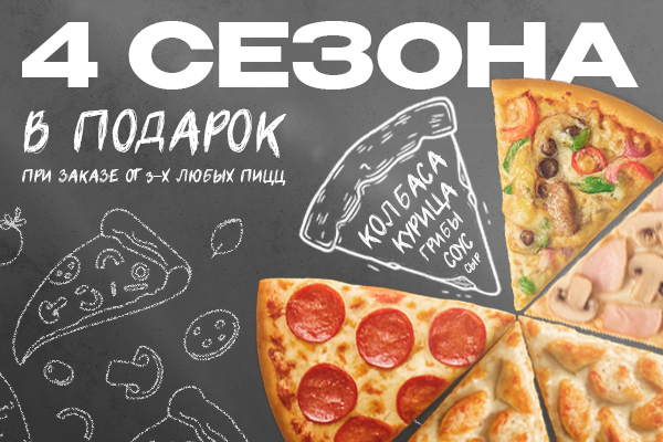 При заказе любых 3-х пицц пицца 4 сезона в подарок!