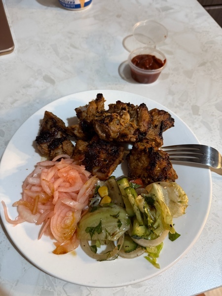 Шашлык к сожалению был подгоревшим. На вкус нормальный, но немного суховатый, как будто подогретый.