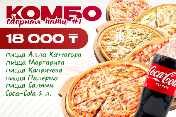 5 пицц и Coca-Cola 2 литра всего за 18 000 тенге!