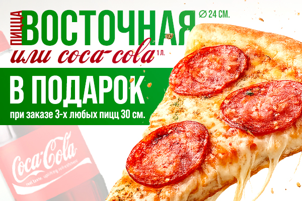 При заказе 3-х любых пицц 30 см. пицца Восточная 24 см. или Coca-Cola 1 л. в подарок! *выбранный подарок укажите в комментариях