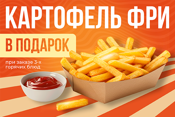 При заказе от 3-х горячих блюд картофель фри в подарок! (АКЦИИ НЕ СУММИРУЮТСЯ)