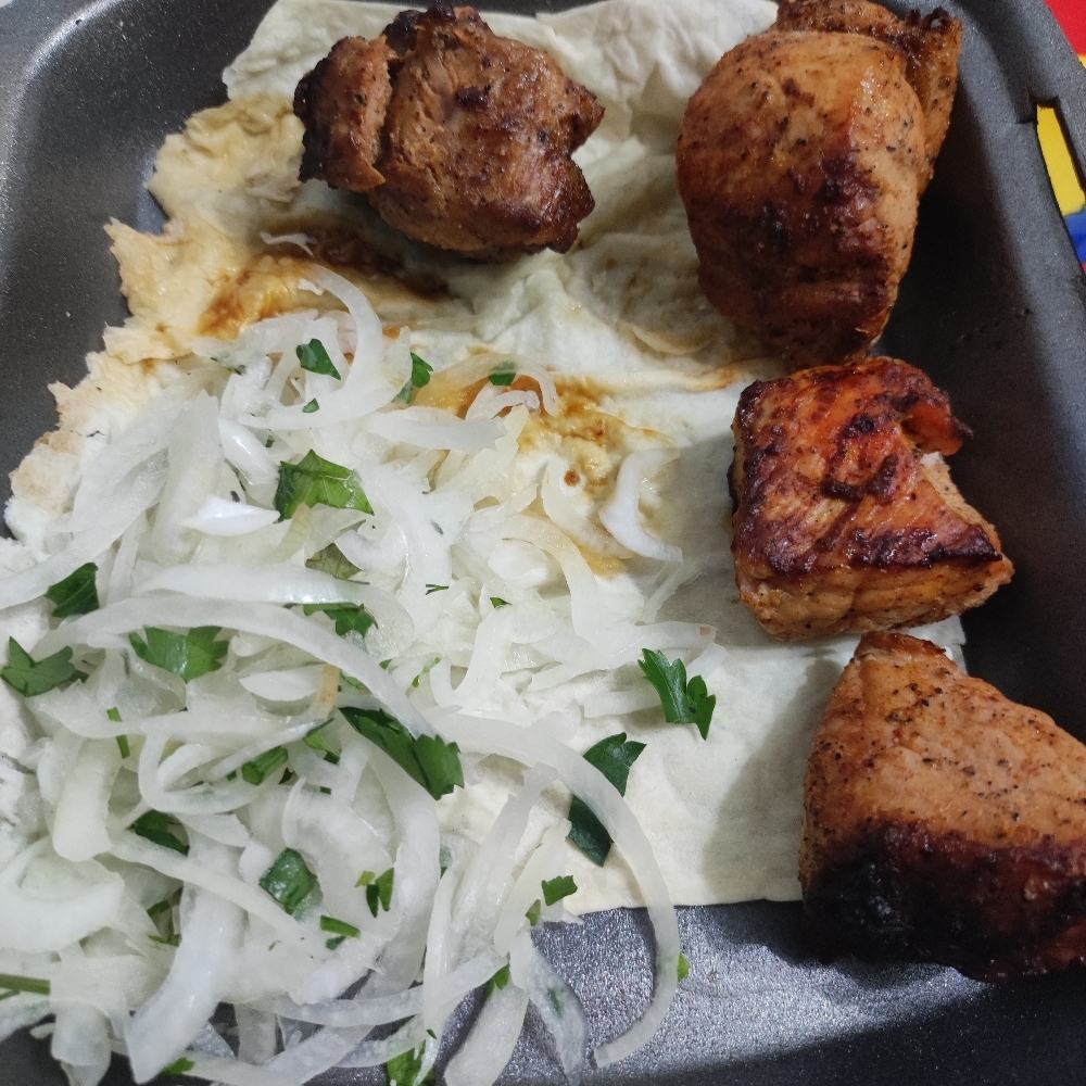 мясо норм,лук не маринованный со странным запахом. доставка быстрая, курьер вежливый. нет салфеток