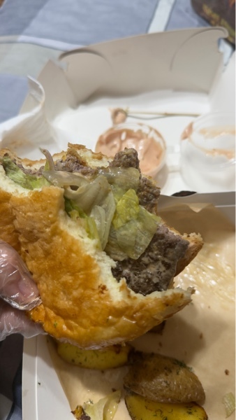 Спасибо за булку с котлетой и луком ,котлета,прожарка которой не могла перейти за время доставки до такого сухаря красный лук и остатки айсберга(кот наплакал)