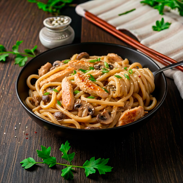 Удон в сливочном соусе с грибами и курицей
