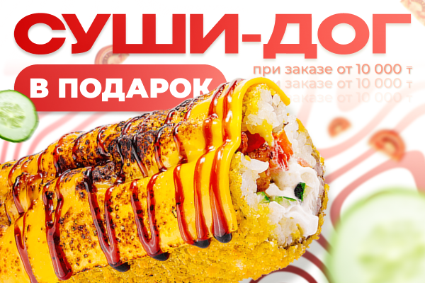 При заказе от 10 000 тг. Суши-дог с лососем в подарок!