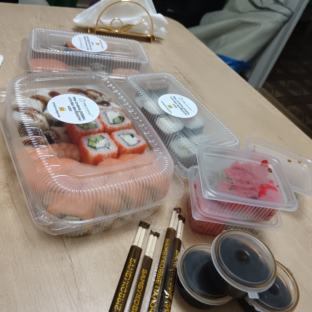 Тихий, бляха муха, ужас. Вы когда запресовываете ролы в одну тару. Да так, что они сидят там один к одному. Чем думаете? Роллы мнутся, разваливаются уже в коробке. Начинка и соус с одних роллов смешивается с другими. Касательно вкуса, отдельный разговор, такое ощущение что бумагу ем Вкус очень слабый. Соевый соус разбавлен. Рис разварен. Рисовый уксус вообще не добавляете? Была бы оценка ниже 1, поставил бы ее. Больше не буду у вас заказывать.